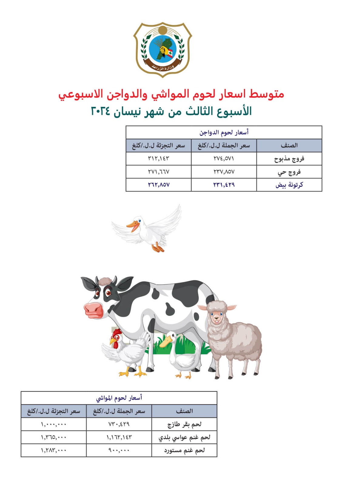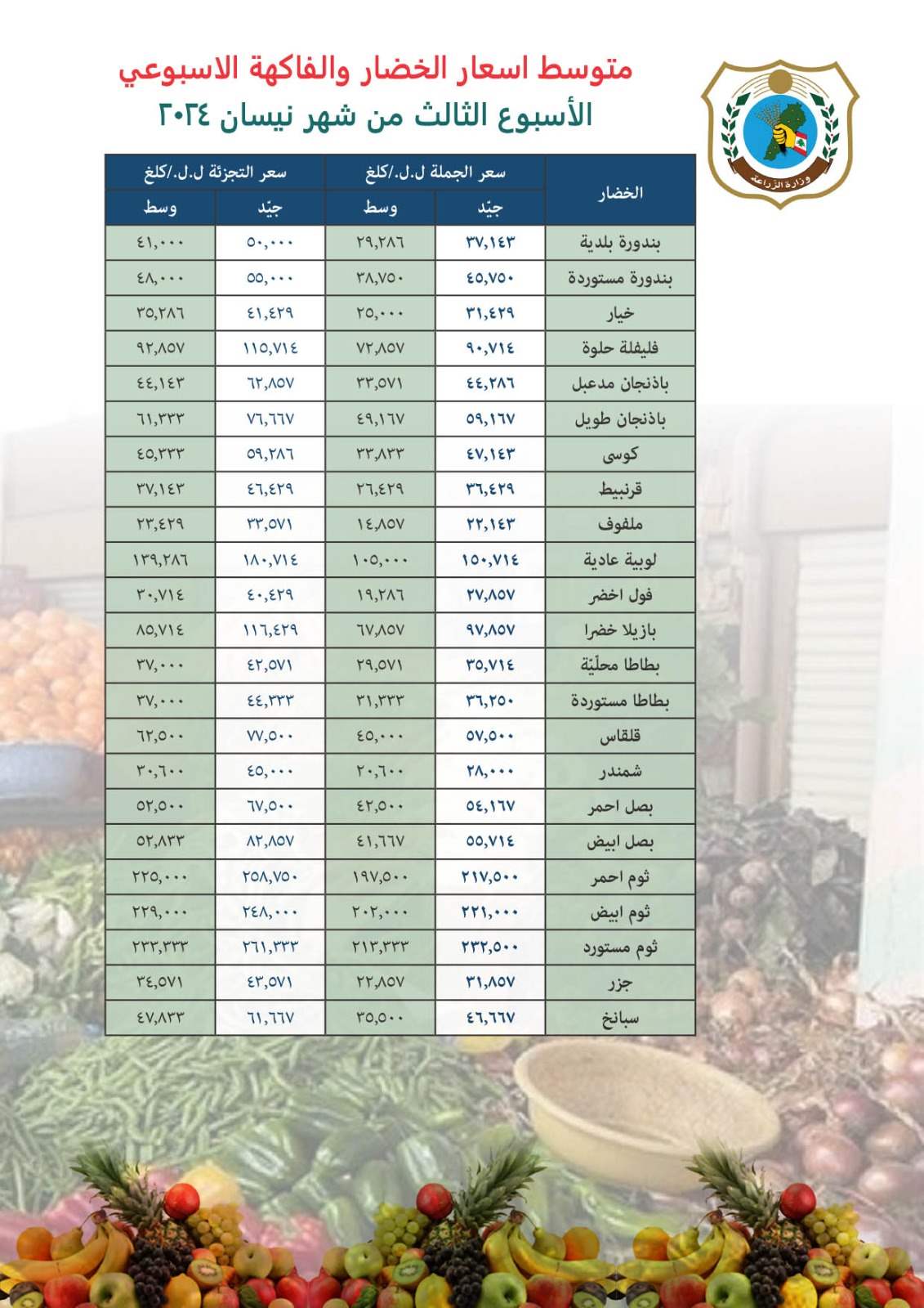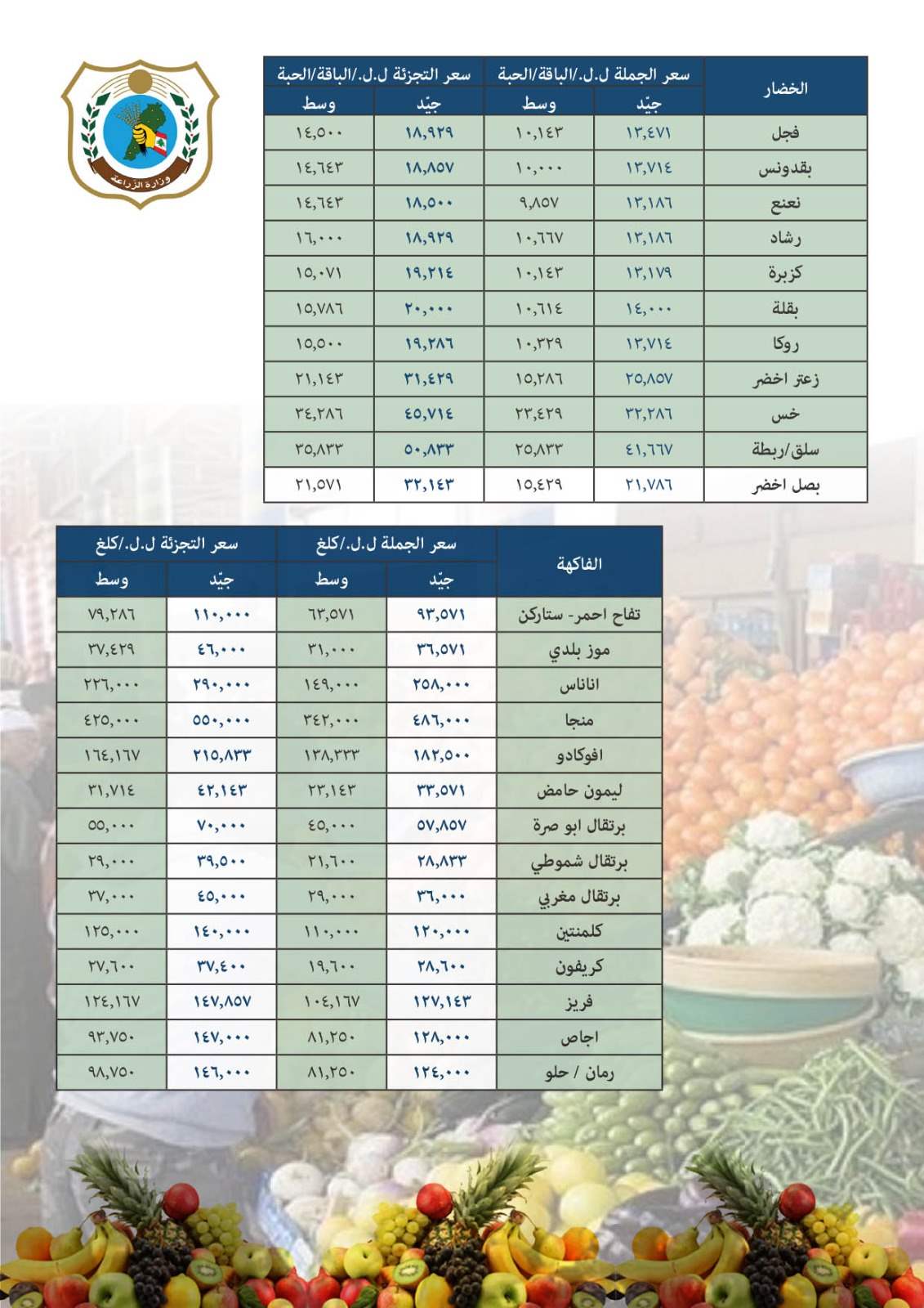 تتابع وزارة الزراعة حركة أسعار الجملة والتجزئة للحوم والخضار والفاكهة بشكل يومي لوضع متوسط للاسعار امام الرأي العام منعاً للتلاعب، ولانسياب السلع بشكل سلس في الاسواق، ونشرت متوسط الاسعار على ان يصدر بشكل منتظم مرتين في الأسبوع.
