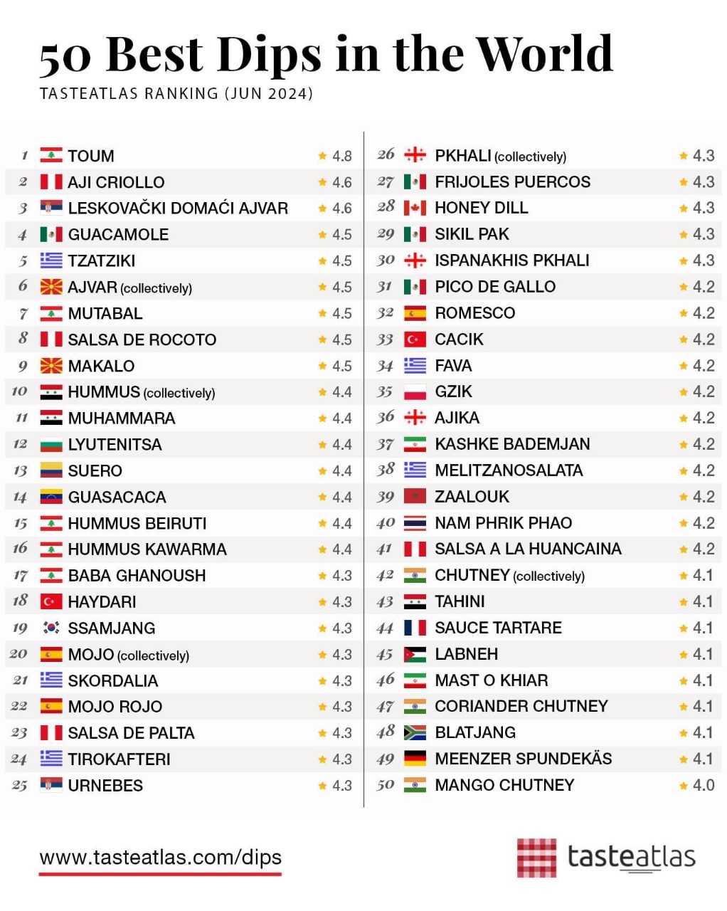 واحتل المتبّل اللبناني المركز السابع، الحمّص البيروتي المركز 15، الحمّص قاورما المركز 16 والبابا غنوج المركز 17.