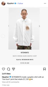 يحمل القميص اسم “وايت أيرونينغ بيرن غرافيك شيرت”، ويتميز بقصة واسعة وطباعة على مستوى الصدر تبدو وكأن القماش تعرض للحرق نتيجة ترك المكواة عليه لفترة طويلة، في محاولة لتقديم لمسة فنية مستوحاة من الحياة اليومية.