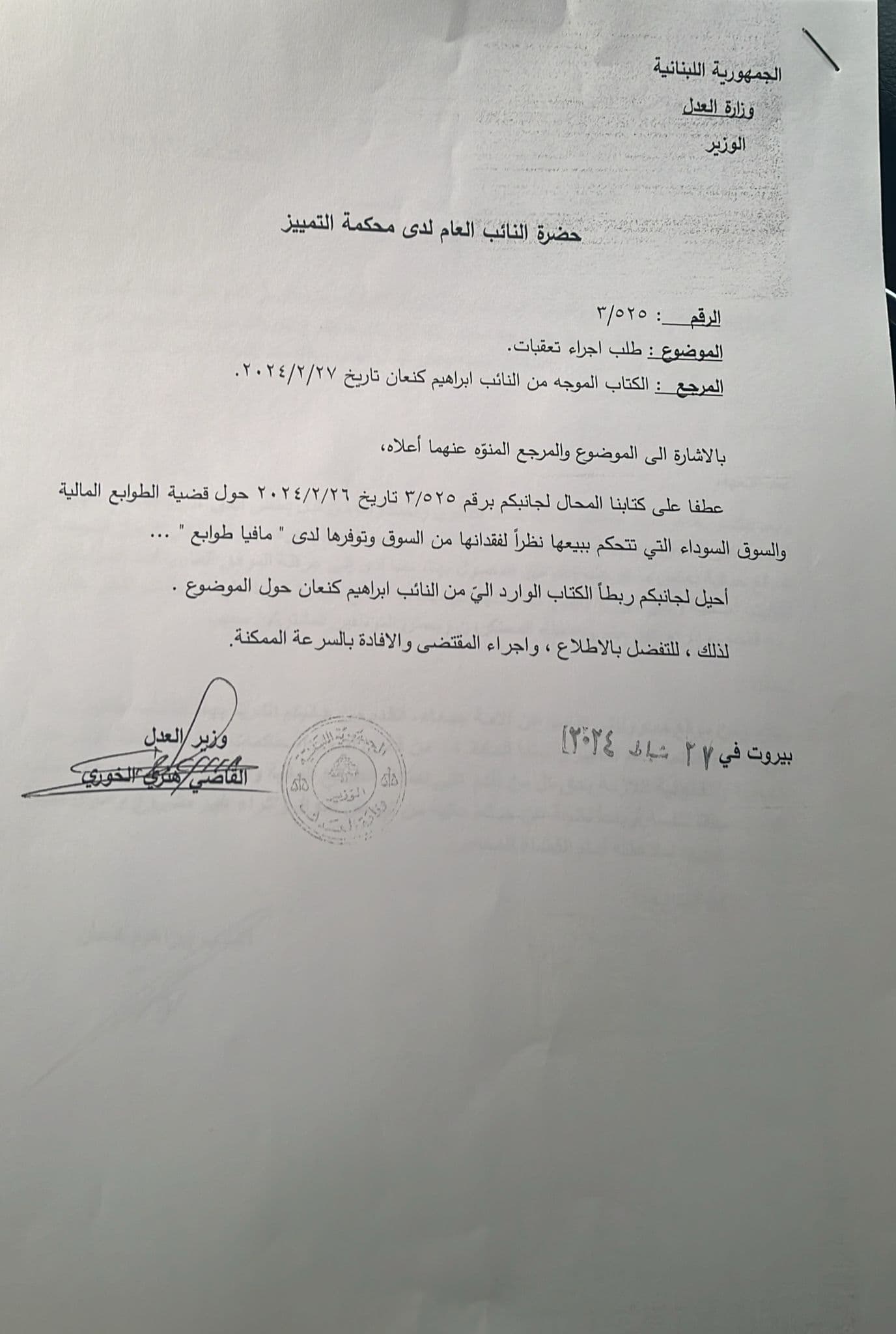 التقى رئيس لجنة المال والموازنة النائب ابراهيم كنعان وزير العدل هنري خوري، وقدّم له إخباراً بشأن فقدان الطوابع المالية والمتاجرة بها في السوق السوداء.