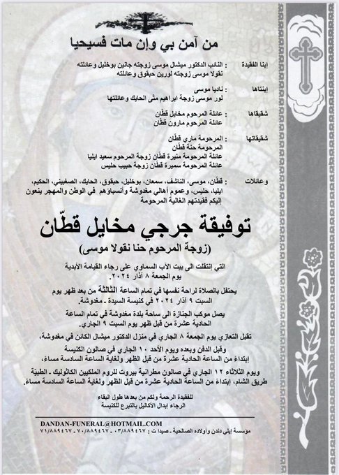 وستتقبل العائلة التعازي اليوم السبت 9 آذار في كنيسة السيدة مغدوشة من الساعة الثالثة بعد الظهر لغاية السادسة مساء.