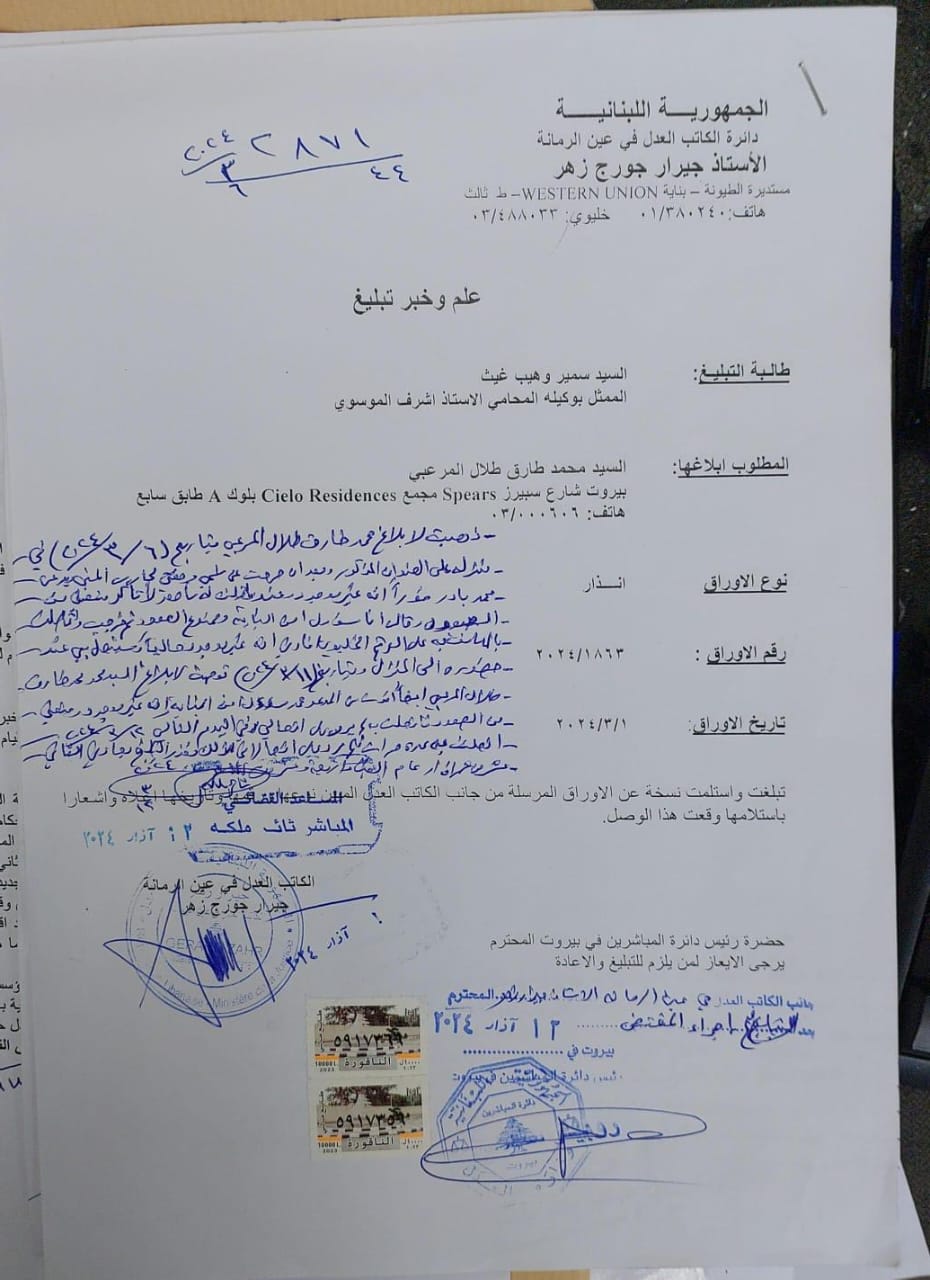 فشلت كل اجراءات تبليغ نائب شمالي سابق المقيم في بيروت، شارع سبيرز، بملك رجل الاعمال سمير غيث، والذي يشغل الشقة دون وجه حق، ويتهرب من كل اجراءات التبليغ.
