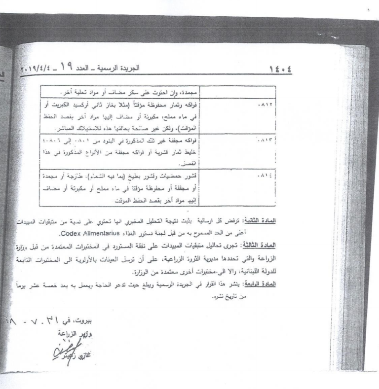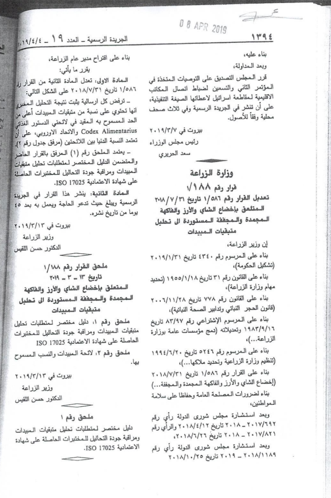 – بتاريخ 13/3/2019، أصدر معالي وزير الزراعة الأستاذ حسن اللقيس القرار رقم 188/1 (مرفق رقم 2) تعديلاً للقرار 586/1 حيث حدّد نسبة متبقيات المبيدات حسب لائحتي الدستور الغذائي Codex Alimentarius والإتحاد الأوروبي على أن تعتمد النسبة الدنيا بين اللائحتين.