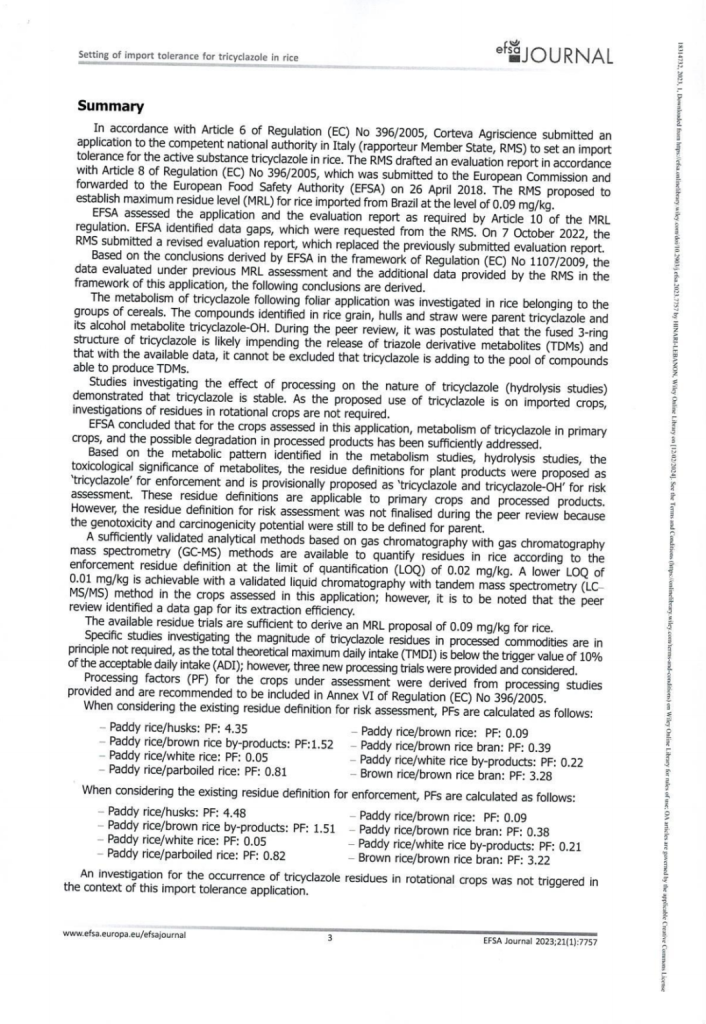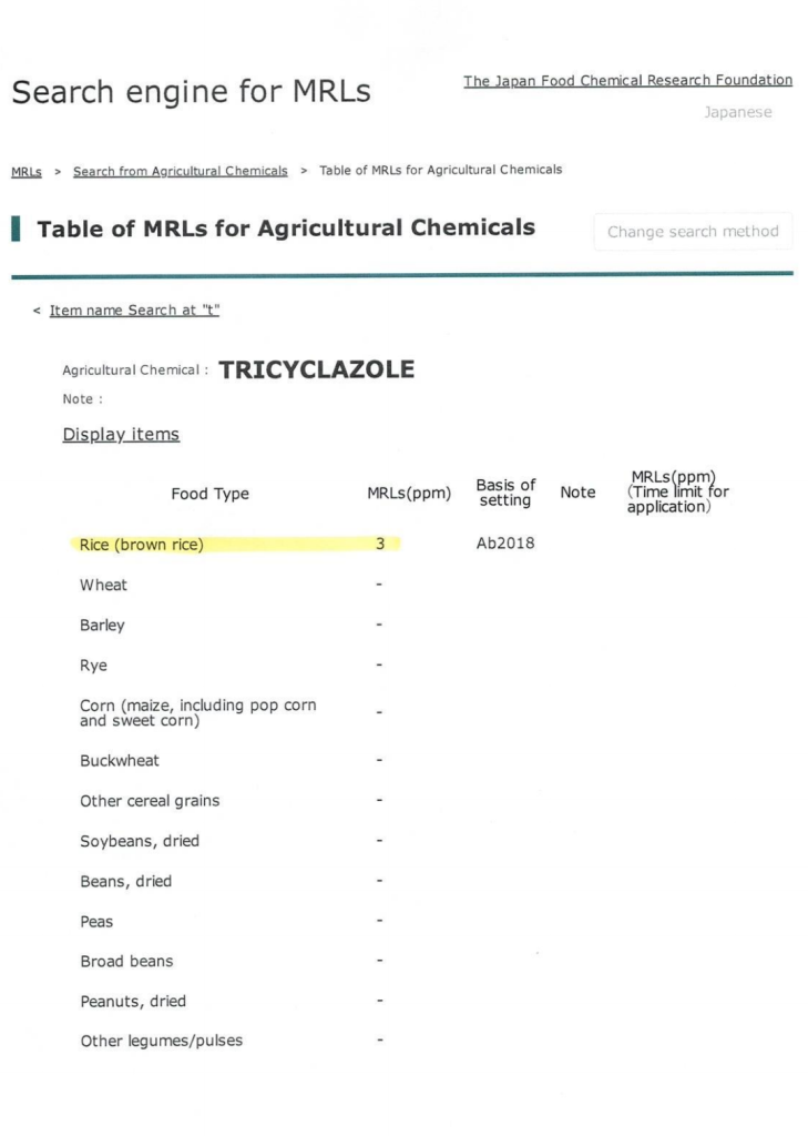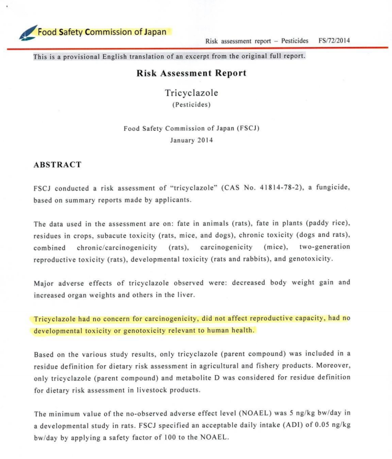 2- إذ أن الدراسة في اليابان (مرفق رقم 3 و4)، Risk Assesment Report-Tricyclazole تؤكّد وبشكل لا ريب فيه أن الـ Tricyclazole هو غير مسرطن ولا تأثير له على صحة الإنسان، كما هو ظاهر في الملحق، وحدّدت النسبة القصوى لهذا المبيد 3.00ppm أي 300 مرة أعلى من النسبة المسموح بها لبنان.