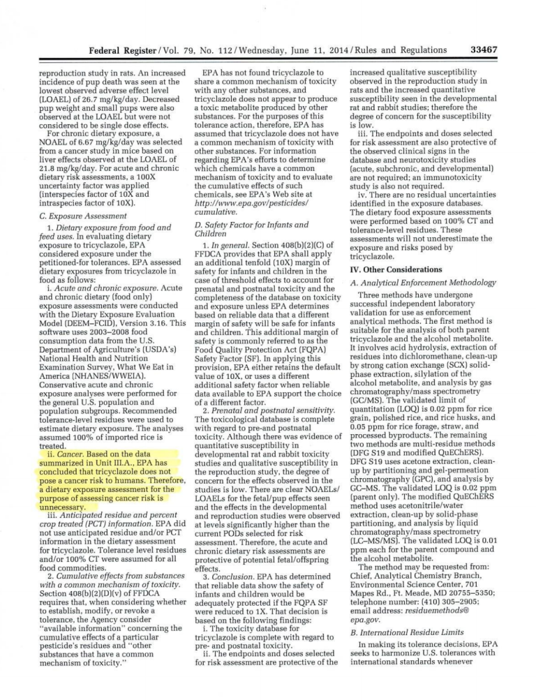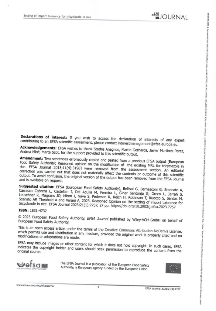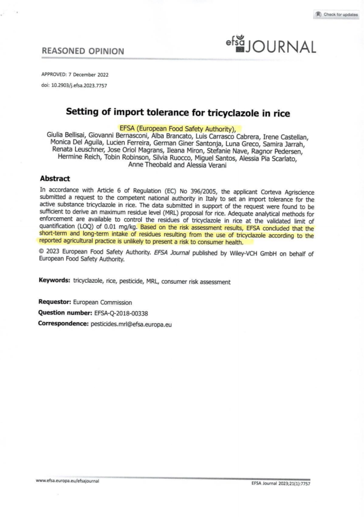 Federal Register-Environemental Protection Agency. EPA-40CFR-180- Tricyclazole تؤكد أيضاً أن هذا المبيد غير مسرطن وتحدّد النسبة العليا بـ3.00ppm مثل اليابان أي 300 مرة أعلى من النسبة في لبنان.