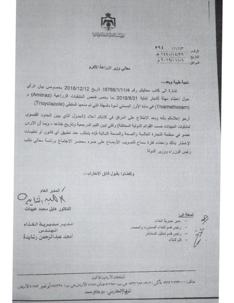 – بتاريخ 31/7/2017، أصدر معالي وزير الزراعة الاستاذ غازي زعيتر القرار رقم 586/1 (مرفق رقم 1) حدّد فيه نسبة متبقيات المبيدات في الأرز والشاي والفاكهة المجمّدة حسب الحد المسموح به من قبل لجنة دستور الغذاء Codex Alimentarius.