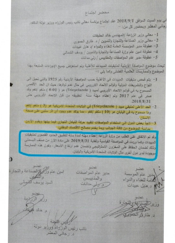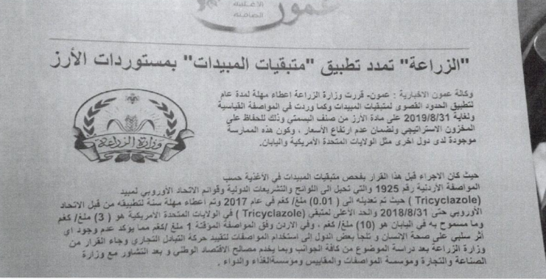 أ- كما هو مذكور في كتاب الوزارة في الأردن (مرفق رقم 8) فإن بعض الدول تلجأ إلى استخدام المواصفات لتقييد حركة التبادل التجاري، علماً أن الـ Tricyclazole يُستعمل في الشرق الأقصى وليس في أوروباـ فتعمد السوق الأوروبية إلى حماية منتوجها من الأرز الوارد من اسبانيا وفرنسا وإيطاليا واليونان وغيرها، بدلاً من الأرز البسمتي أو الطويل القادم من الهند والصين وتايلندا وغيرها.