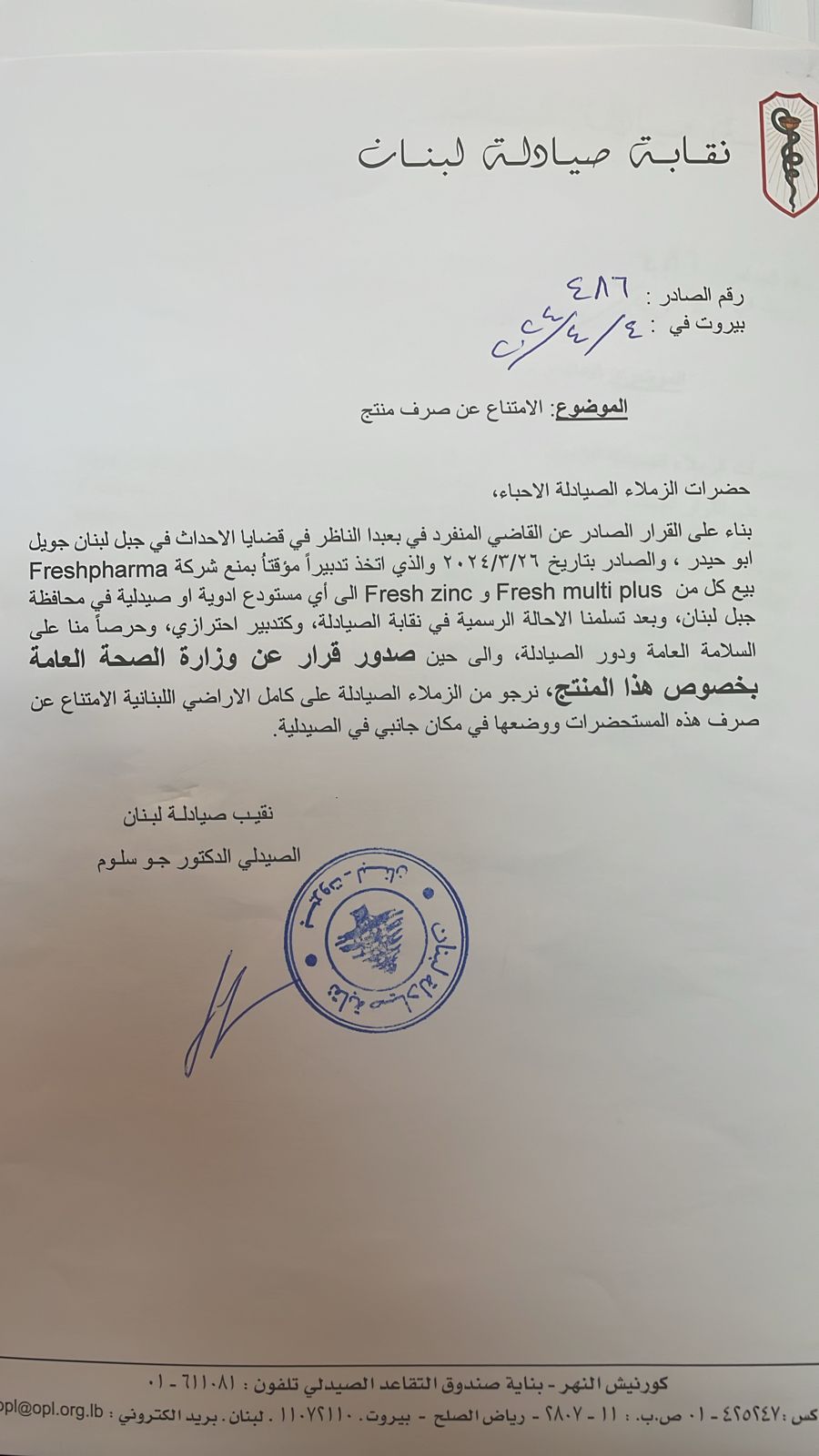طالبت نقابة صيادلة لبنان، الصيادلة بالامتناع عن صرف مستحضرات Fresh multi plus وFresh zinc المباعة من شركة Freshpharma، ووضعها في مكان جانبيّ في الصيدلية، إلى حين صدور قرار عن وزارة الصحة.