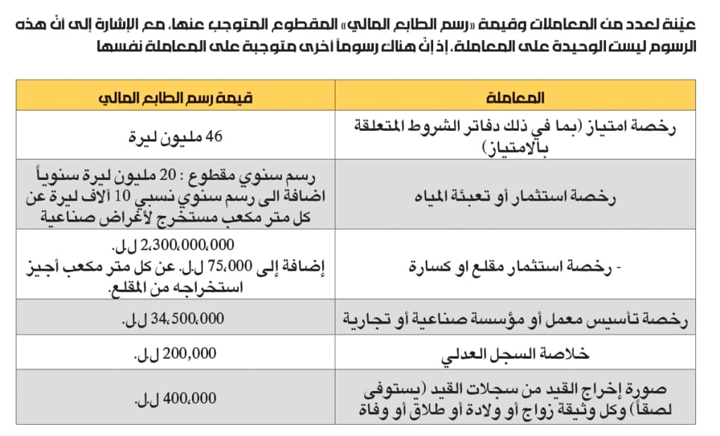 وتشكل عائدات الخزينة العامة من رسم الطابع ما يزيد عن 125 مليون دولار سنوياً كمبلغ مقدر في موازنة عام 2024، ما يوازي مجموع اعتمادات سبع وزارات معاً، هي وزارات السياحة والإعلام والزراعة والعدل والاقتصاد والتجارة والثقافة والعمل، ما يشير إلى أهمية إيلاء جباية هذا الرسم عناية خاصة.