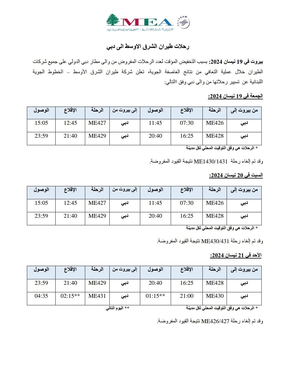الـMEA تعدّل مواعيد رحلاتها إلى دبي