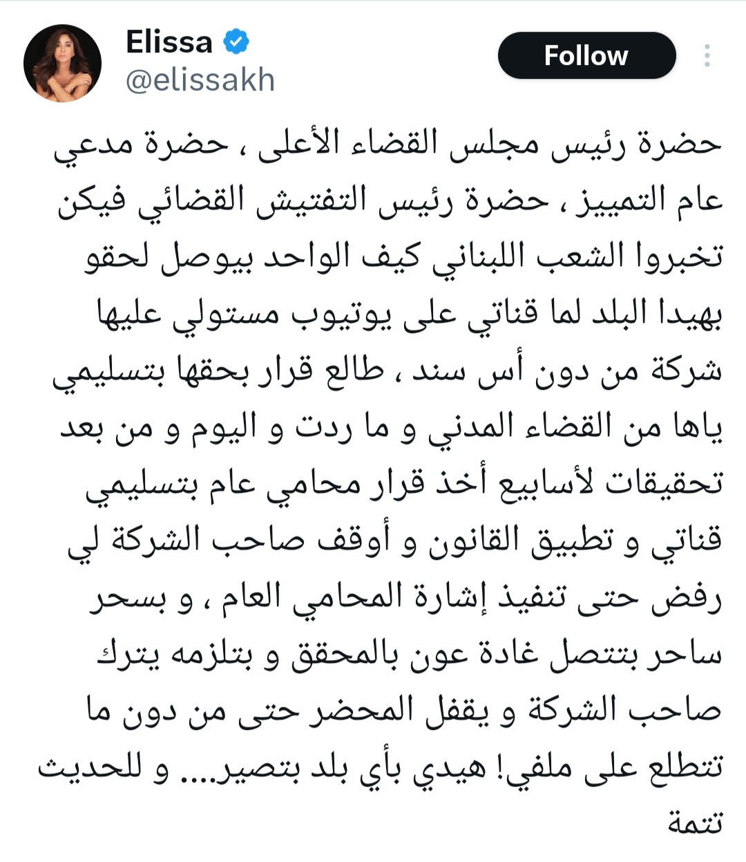 توجّهت إليسا بمنشورٍ عبر حسابها على “أكس” إلى كلّ من رئيس مجلس القضاء الأعلى، مدعي عام التمييز، ورئيس التفتيش القضائي طالبتهم من بتنفيذ قرار صادر لمصلحتها في ما خصّ قناتها على يونيوب. وكتبت إليسا:” حضرة رئيس مجلس القضاء الأعلى ، حضرة مدعي عام التمييز ، حضرة رئيس التفتيش القضائي فيكن تخبروا الشعب اللبناني كيف الواحد بيوصل لحقو بهيدا البلد لما قناتي على يوتيوب مستولي عليها شركة من دون أس سند ، طالع قرار بحقها بتسليمي ياها من القضاء المدني و ما ردت و اليوم.