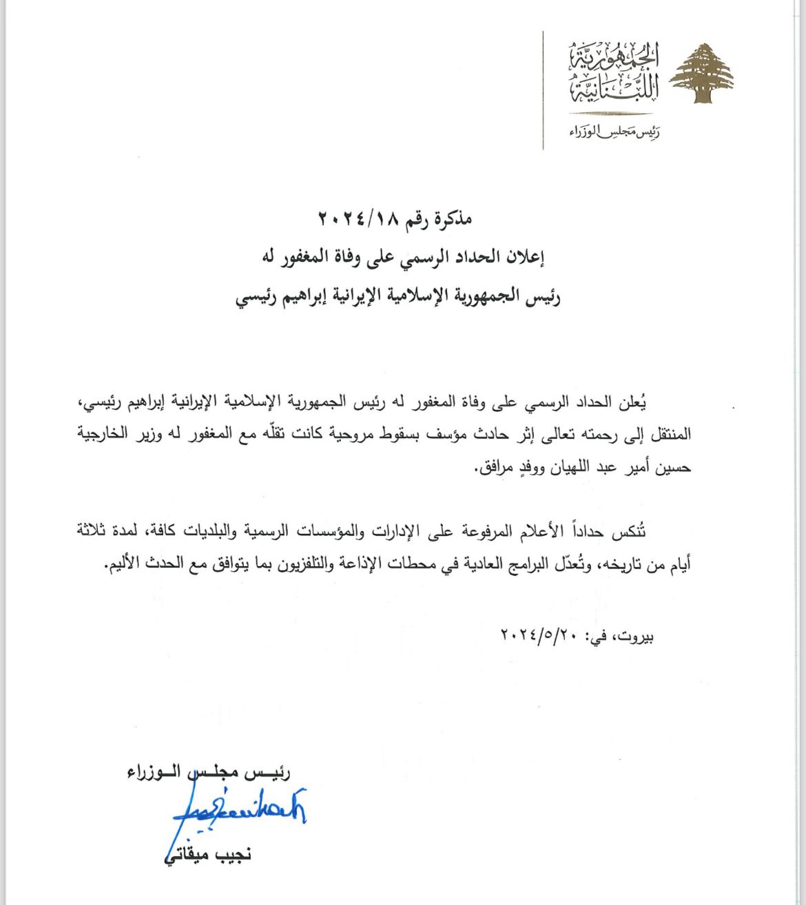 أعلن رئيس حكومة تصريف الأعمال نجيب ميقاتي، في مذكرة تحمل الرقم 2024/18، “الحداد الرسمي ثلاثة أيام على وفاة رئيس الجمهورية الإسلامية الإيرانية ابراهيم رئيسي.