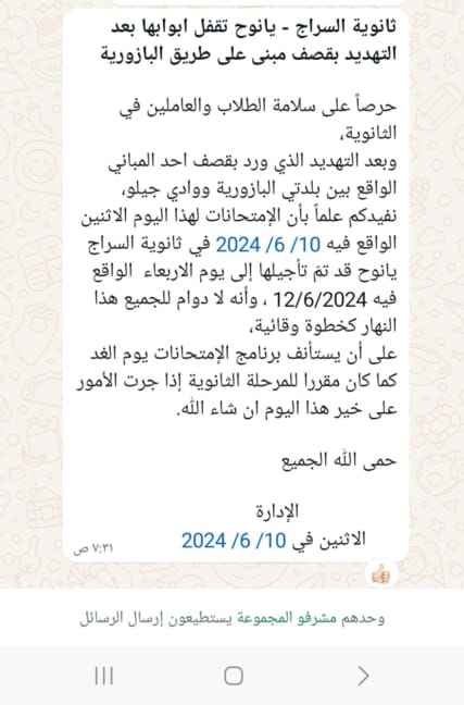 بالصورة: إغلاق مدارس في الجنوب بسبب رسالة “واتساب”