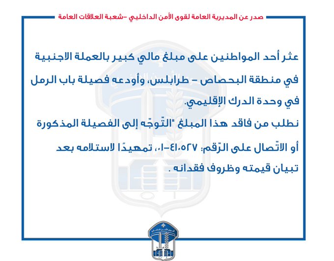نطلب من فاقد هذا المبلغ التوجّه إلى الفصيلة المذكورة أو الاتصال على الرقم: 01410527، تمهيدًا لاستلامه بعد تبيان