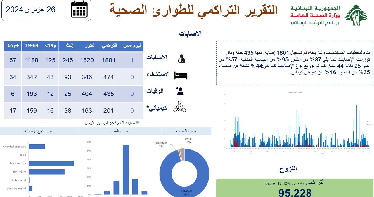 متابعةً للعدوان الاسرائيلي على لبنان، نشرت وزارة الصحة العامة التقرير التراكمي للطوارئ الصحية ل٢٦ حزيران ٢٠٢٤، وقد تم تسجيل 1801 اصابة ، 435 منها وفيات.