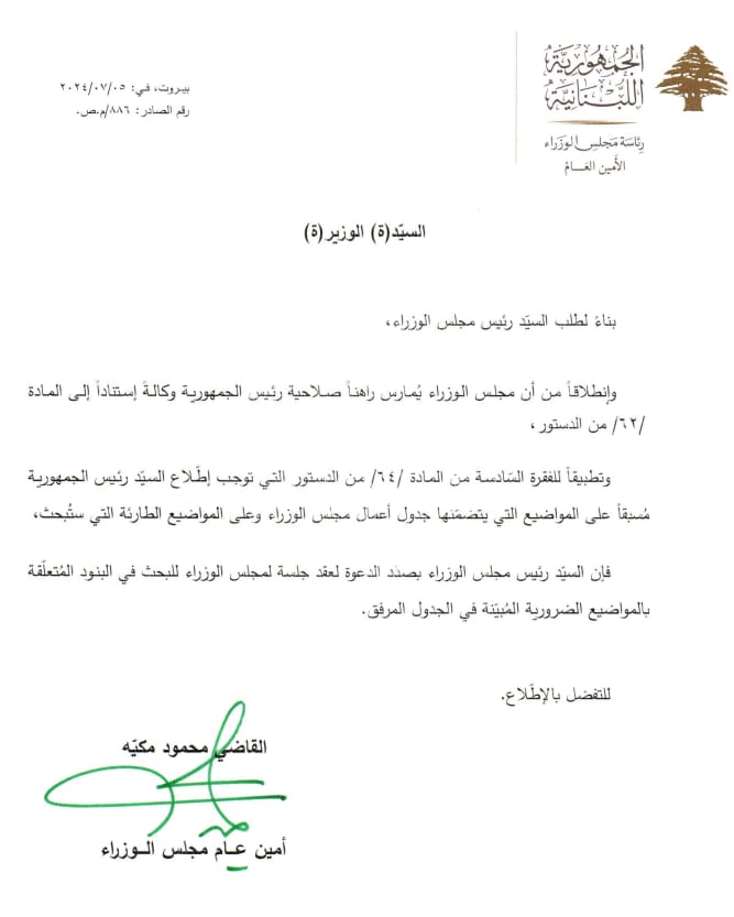 أعلنت رئاسة مجلس الوزراء أن رئيس الحكومة نجيب ميقاتي بصدد الدعوة الى عقد جلسة لمجلس الوزراء للبحث في جدول أعمال من ثلاثين بندا.