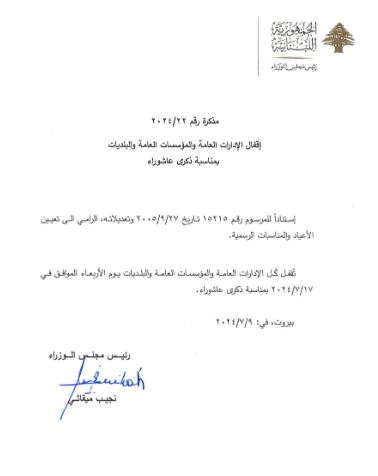 صدر عن مجلس الوزراء، اليوم الثلاثاء، مذكرة رقم 2024/22، جاء فيها: “إقفال الإدارات العامة والمؤسسات العامة والبلديات بمناسبة ذكرى عاشوراء”.