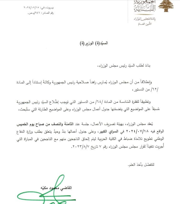 يعقد مجلس الوزراء بهيئة تصريف الأعمال، جلسة عند الساعة الثامنة والنصف من صباح يوم الخميس في السراي، وعلى جدول الأعمال بند وحيد.