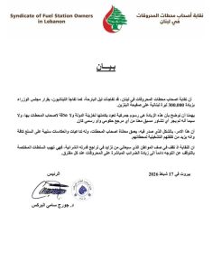 وأكد البيان أن هذه الزيادة هي رسوم جمركية تعود بكاملها إلى خزينة الدولة، ولا علاقة لأصحاب المحطات بها، ولا سيما أنه لم يجرِ أي تشاور مسبق مع النقابة من أي مرجع حكومي أو رسمي.