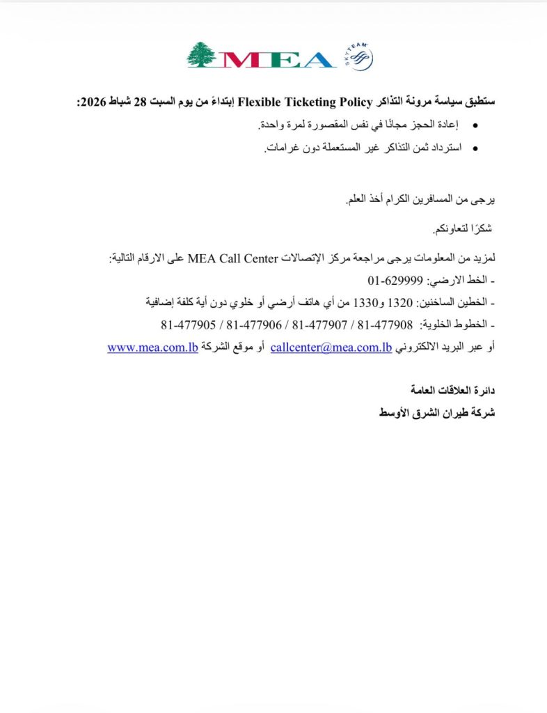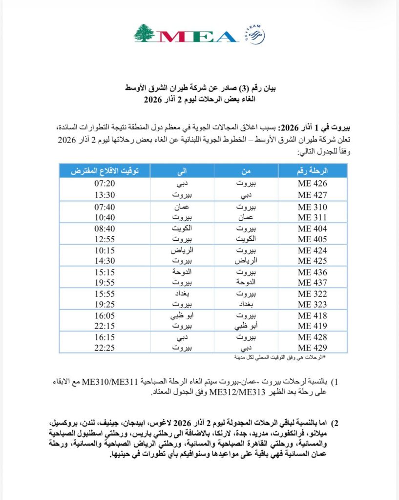 صدر عن شركة طيران الشرق الأوسط بيان، بشأن إلغاء بعض الرحلات ليوم 2 آذار 2026، تجدونه مرفقاً.