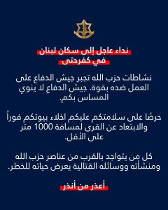 كتب المتحدث باسم الجيش الإسرائيلي أفيخاي أدرعي عبر “أكس”: “إنذار عاجل إلى سكان كفرحتى في جنوب لبنان”.