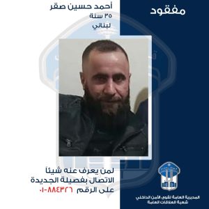 أصدرت المديرية العامة لقوى الأمن الداخلي اليوم الأحد، بناءً على إشارة القضاء المختص، نداءً للعثور على المواطن أحمد حسين صقر (مواليد 1991)، الذي فُقد الاتصال به مساء 2-4-2026 أثناء قيامه بعمله على متن سيارة أجرة، ولم يعد إلى منزله في محلّة السبتيّة الجديدة حتى اليوم.