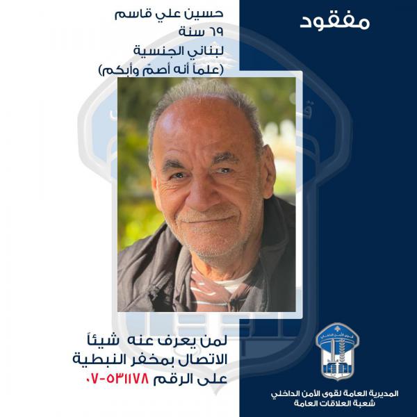 صـدر عـــن المديريّـة العامّـة لقــوى الأمــن الدّاخلـي _ شعبــة العلاقــات العامّــة، تعميم جاء فيه: “تُعمِّم المديريّة العامّة لقوى الأمن الدّاخلي بناءً على إشارة القضاء المختص، صورة المفقود حسين علي قاسم (مواليد عام 1955، لبناني)”.