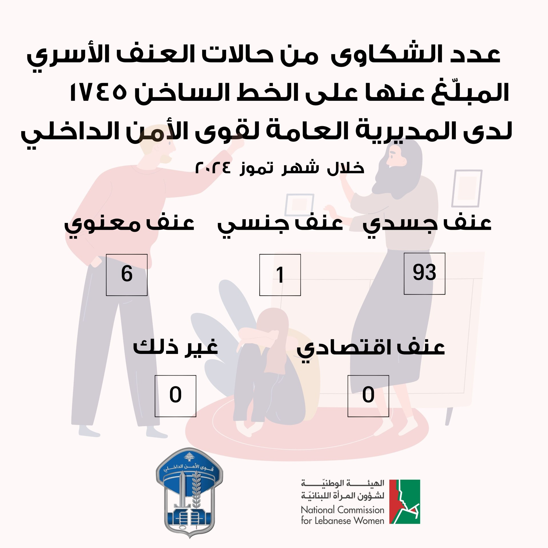 وزّعت المديرية العامة لقوى الأمن الداخلي، عدد الشكاوى من حالات العنف الأسري المبلّغ عنها، لشهر تموز 2024.