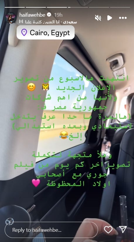 حيث كتبت هيفا: “انتهيت هالأسبوع من تصوير الإعلان الجديد، ولأنها من أهم شركات جمهوريّة مصر، هالمرّة ما حدا عرف يتدخّل لإستبعادي وبعده استبدالي”. وتابعت هيفا قائلة: “وهلق متجهة لتكملة تصوير آخر كم يوم من فيلم جوري مع أصحابي أولاد المحظوظة”.