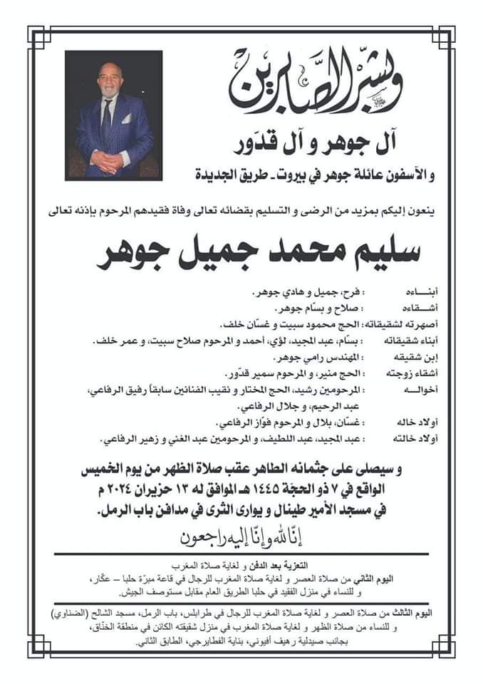 توفي الممثل اللبناني سليم جوهر، صباح اليوم الخميس، إثر معاناة مع المرض.