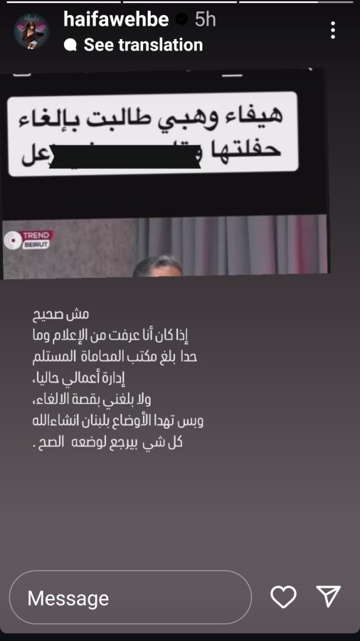 ومن جهتها، نشرت الفنانة هيفاء وهبي عبر خاصية الستوري على حسابها في إنستغرام ما يلي: “مش صحيح، إذا كان أنا عرفت من الإعلام وما حدا بلغ مكتب المحاماة المستلم إدارة أعمالي حاليًا، ولا بلغني بقصة الإلغاء. وبس تهدا الأوضاع في لبنان إن شاء الله كل شيء بيرجع لوضعه الصح”.